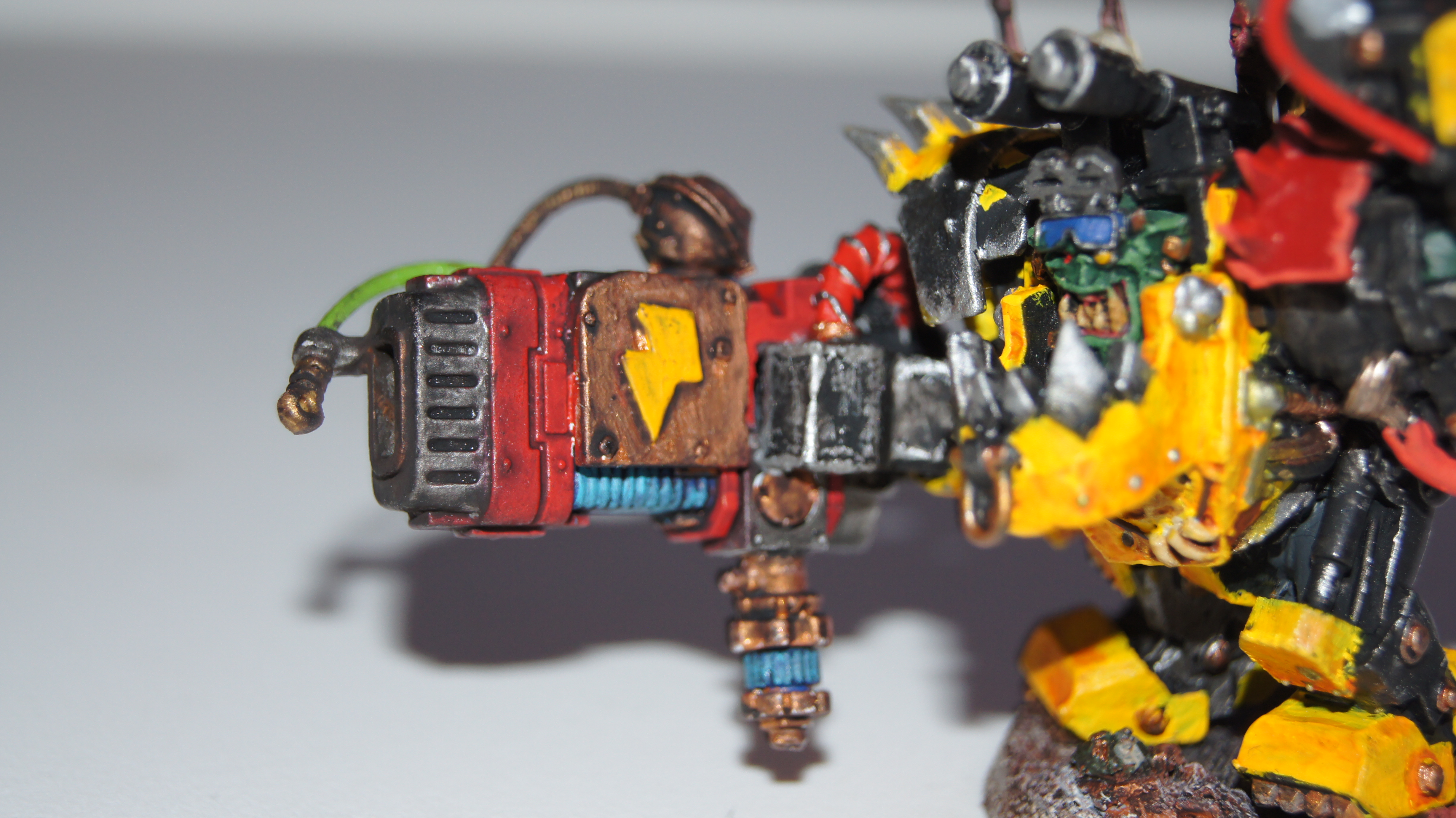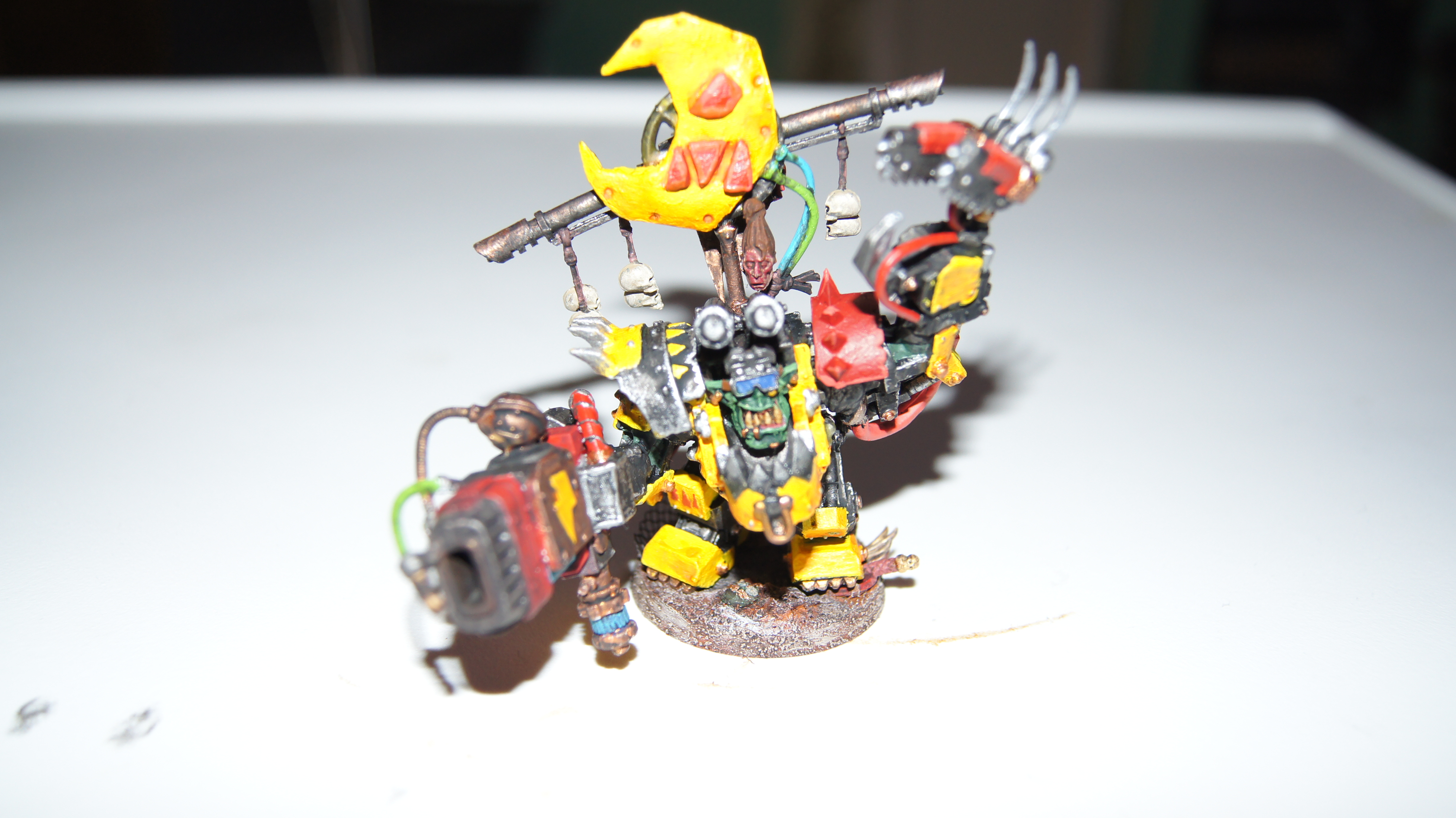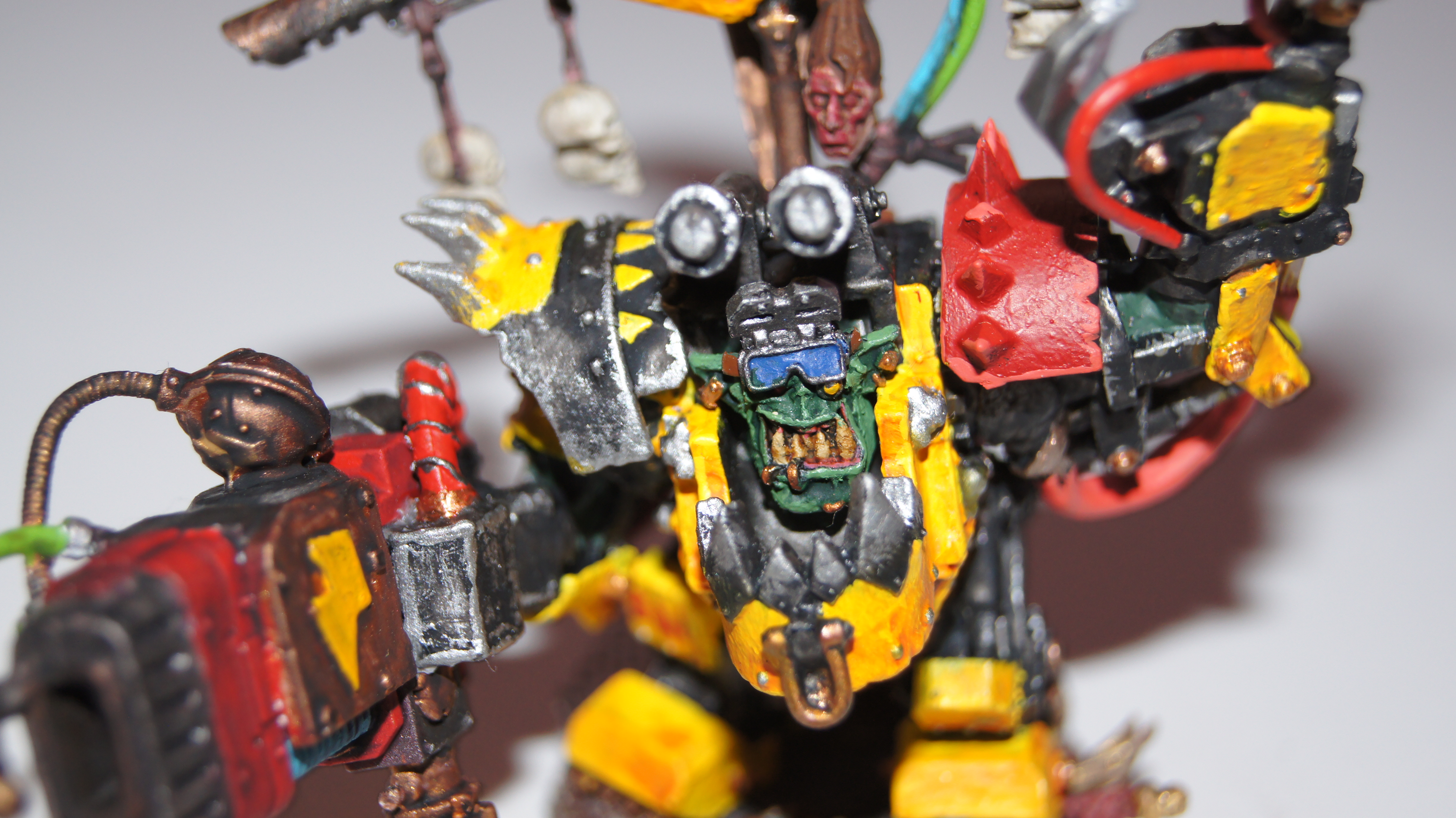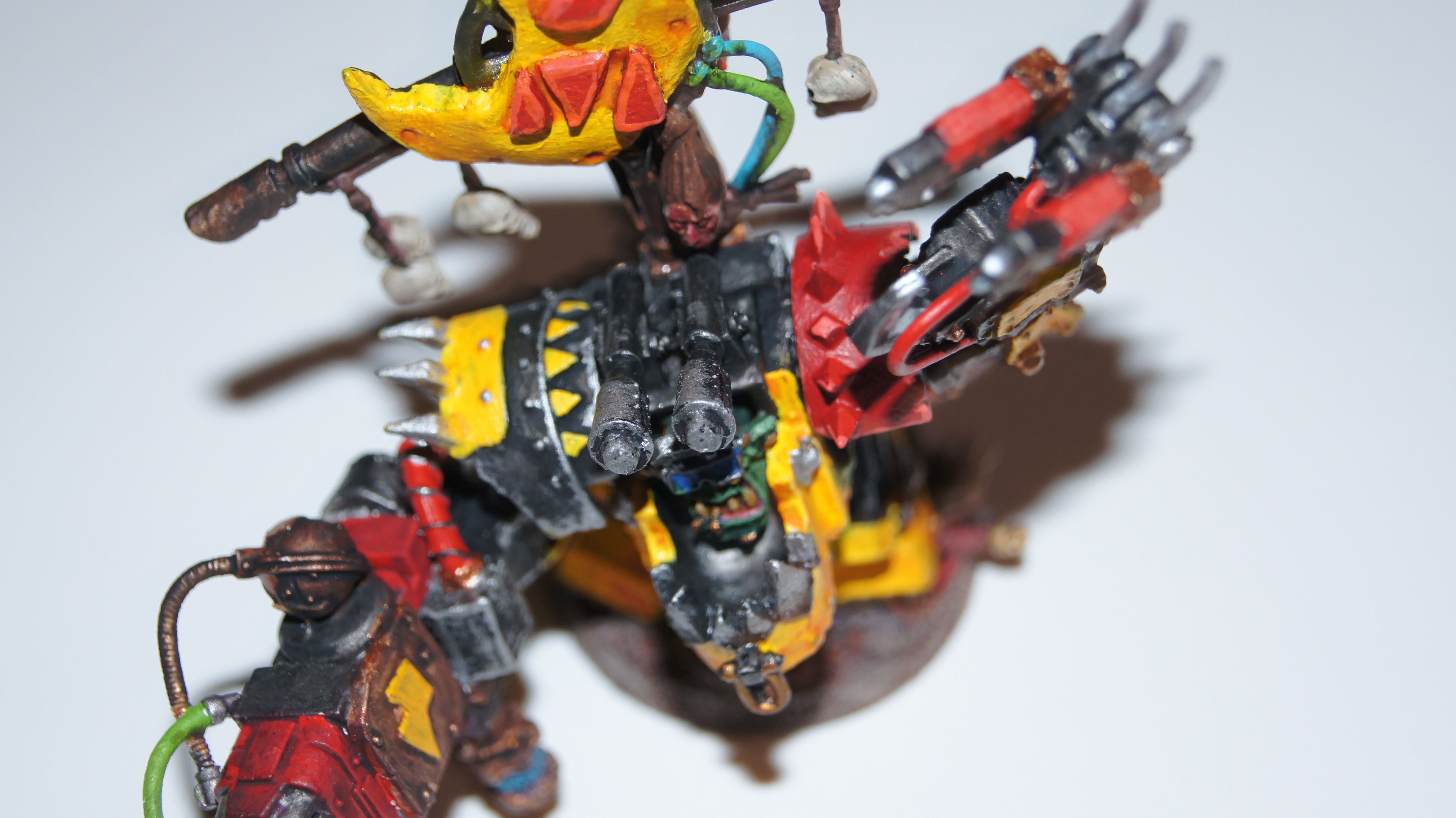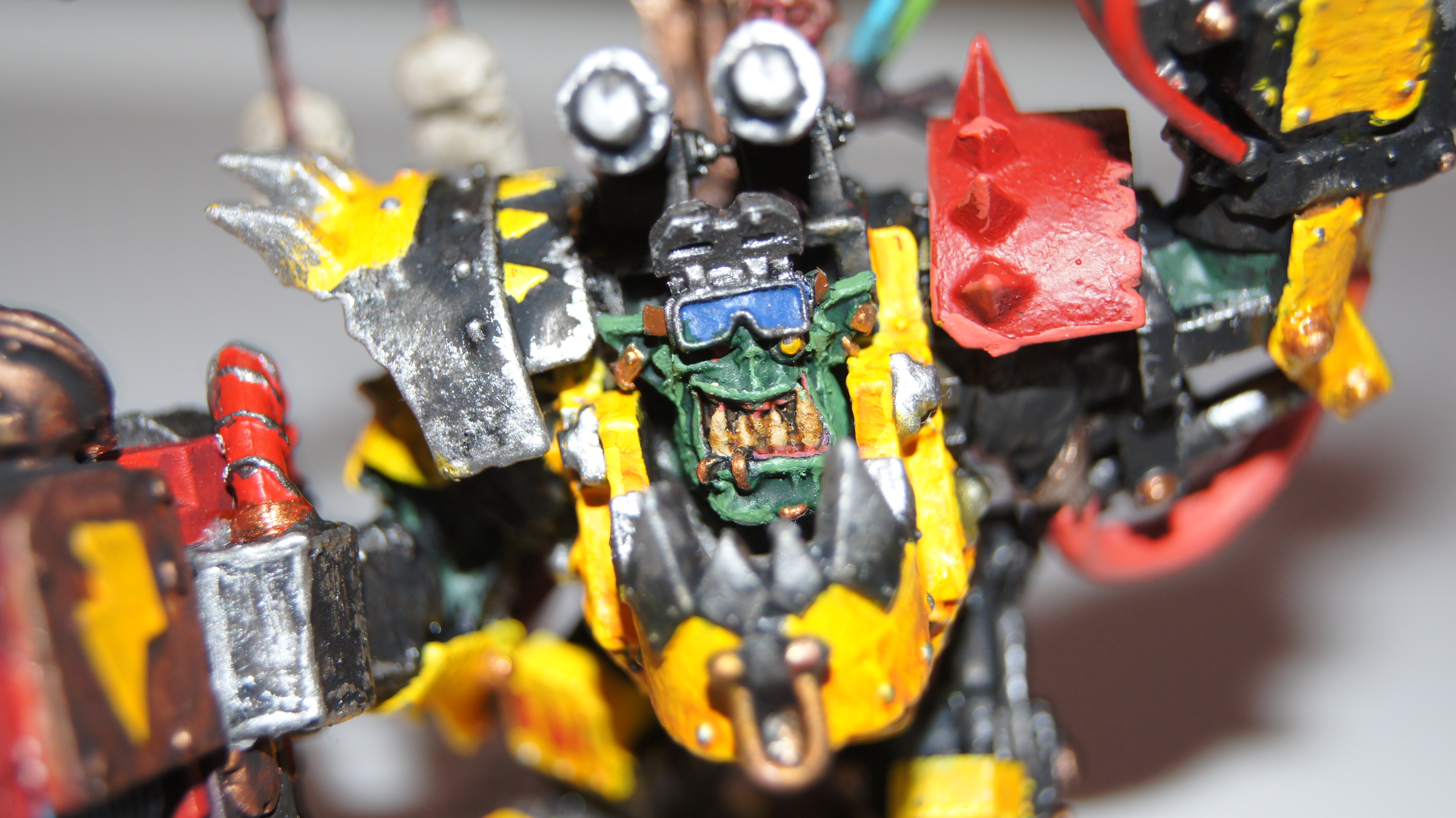 I used the older Big Mek head so he had a different face from Ghazghkull that gave him a Mek look without having weird screws in his head. I also liked the smug grin and goggles.