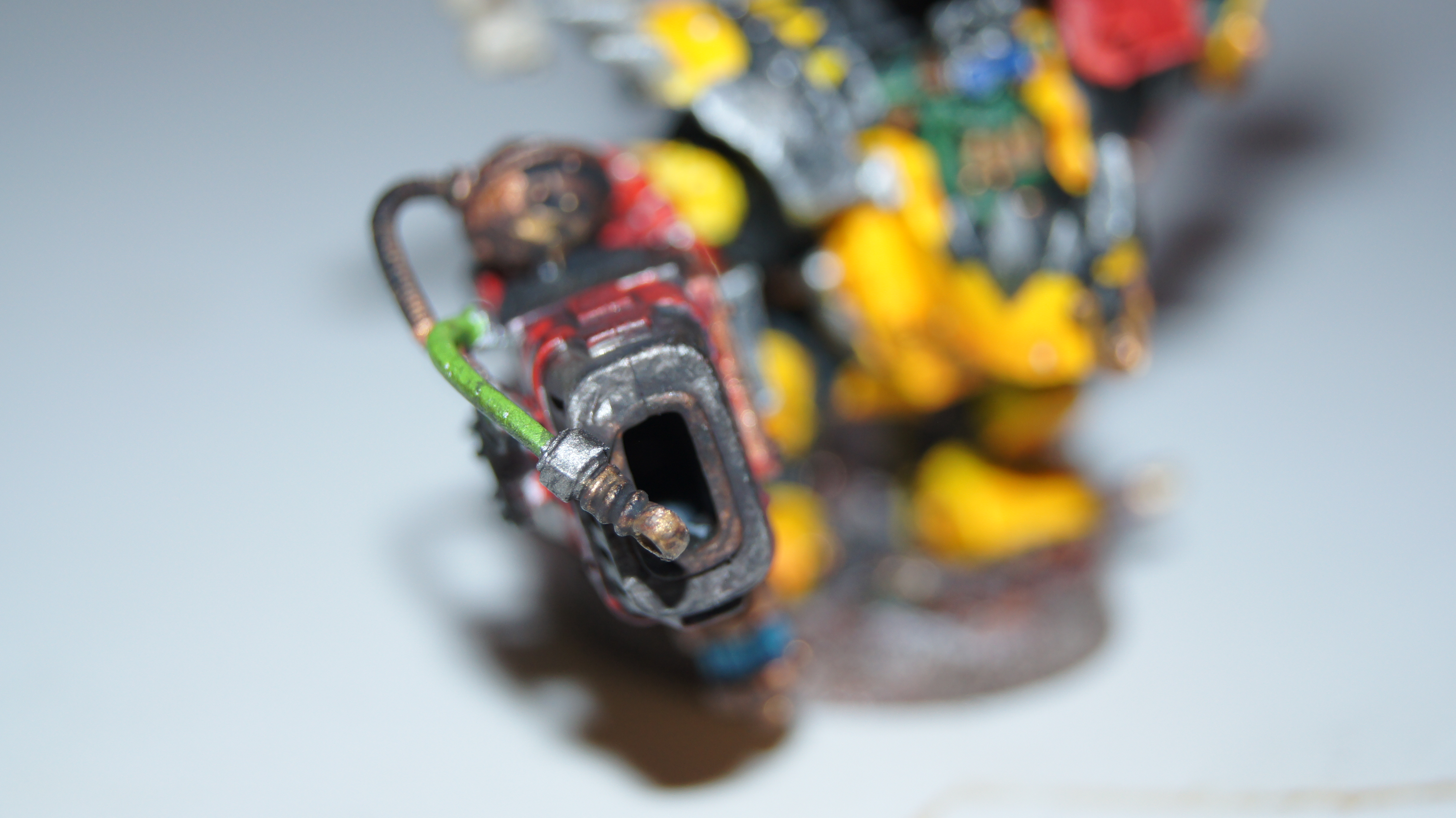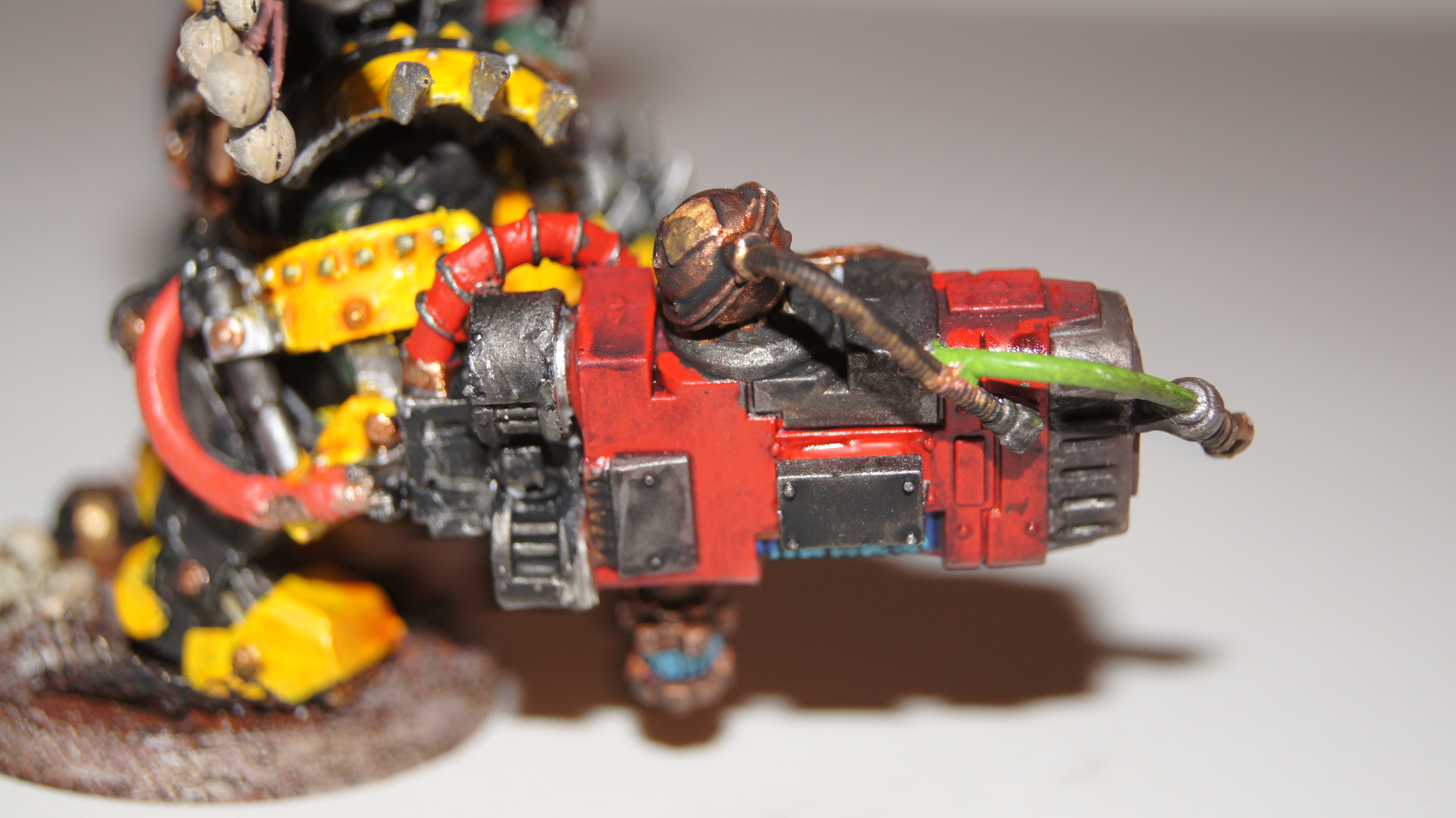 The most difficult, but fun, part of the model was the Kustom-Blasta-X, Nazdreg’s supa-gun. It’s frequently described as being “multi-barreled” but because it has the “gets hot” profile and the same feel as a plasma gun I thought it would be good to make it LOOK like a plasma gun. I sheared off the twin-linked big shoota that came with the model (never cut off so much metal before) and used one of the plasma storm batteries from the Land Speeder Vengeance kit. The little piece underneath is actually a re-fashioned mace head and it has the power supply from a megablasta off of an extra Mek on top.