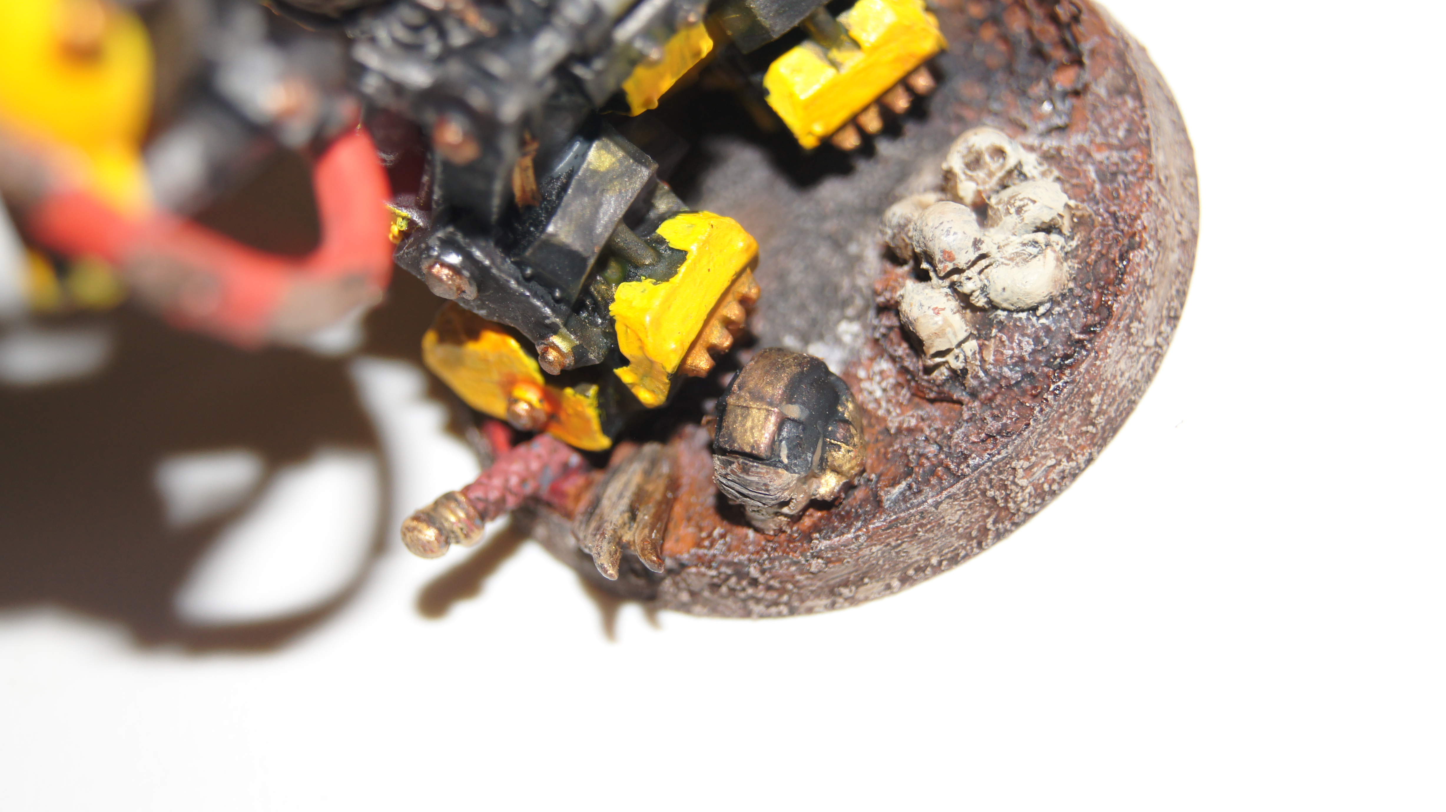 There wasn’t an appropriately massive Bad Moon bosspole, so I made my own out of green stuff. I mounted it on the Lascannons from a Forgeworld Tauros Venator I turned into a warbuggy and stuck a deffdread face on the back. The skulls came from the Chaos Defiler kit, whose bitz have served me so well since I converted it to the Dredtrukk. It’s not perfect but I ended up really liking the look of the moon.