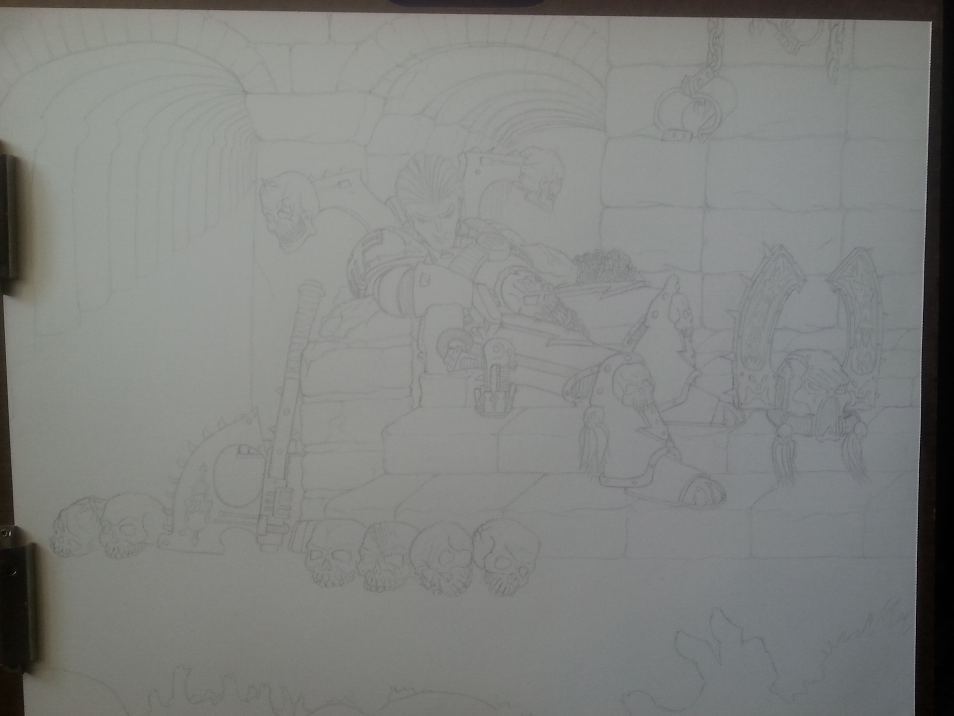 This is the earliest design; I sketched it on a piece of printer paper while waiting for something at work to finish.  The design is very rudimentary.  The dais looks more “chair” like, and the axe is on the wrong side (I picture Malvin entering left and seeing Kharn on the right for some reason) so Gorechild should be left rather than right in the frame as he sees the weapon before he sees The Betrayer.  I was also drawing from memory and messed up Kharn’s helmet design.