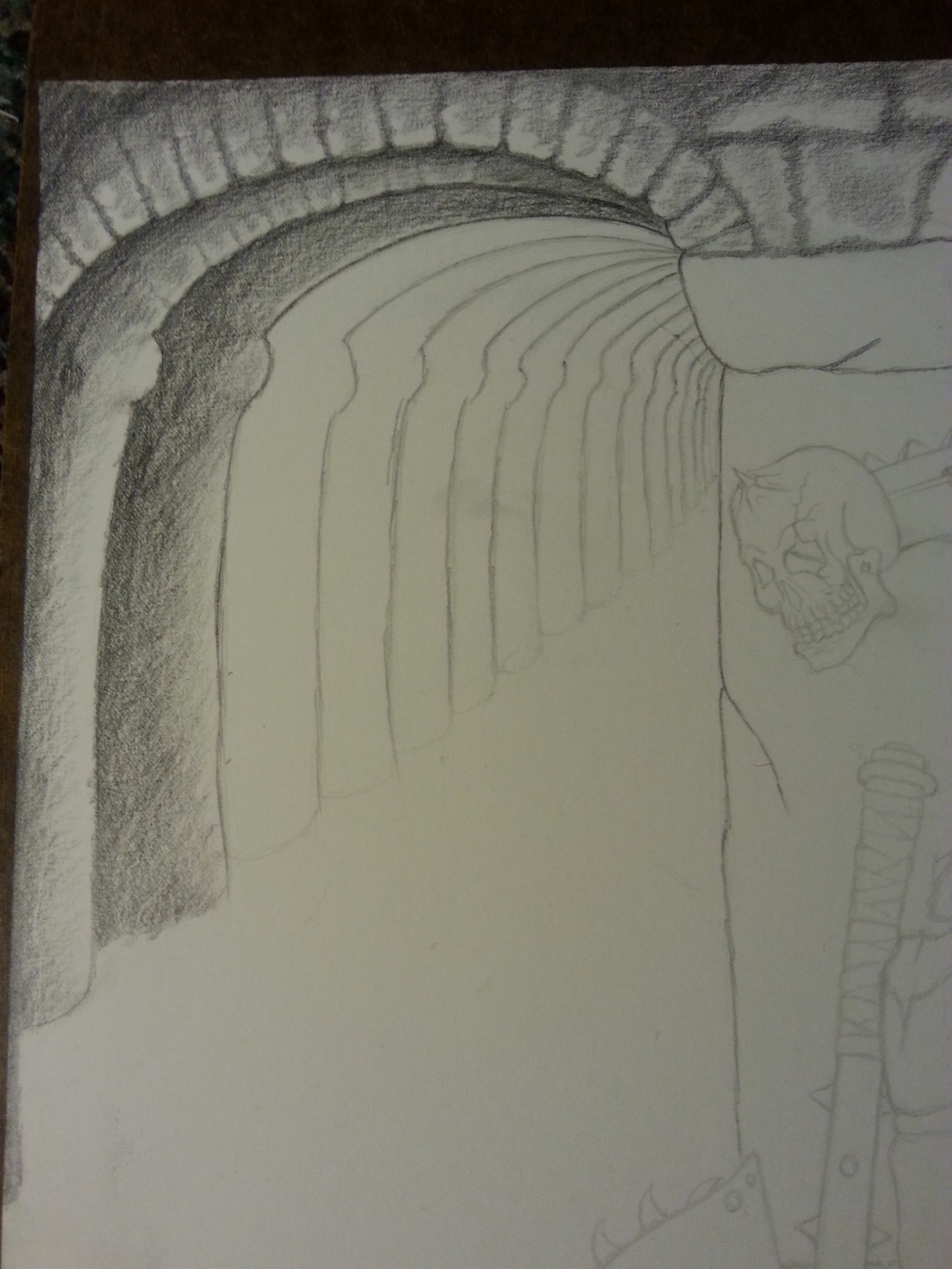 I accidentally over-shaded the left tunnel and made it seem too short.  It took some correcting to get it closer to right.  I added the close foreground of silhouetted scattered remains based on the description in the drama. I left it vague but clear enough to be picked out if closely analyzed.