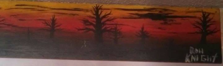 I first noticed I had a knack for painting at the age of 14. We did a few painting projects in art class, and I thoroughly enjoyed myself. My mom actually posted my first real painting I did on Facebook not long ago. Yellow and red skyline with silhouettes of trees with no leaves painted on a table leaf. The trees with no leaves has become one of my signature works. I have quite a few of them now, and typically if someone requests a tree painting, that’s what they want.