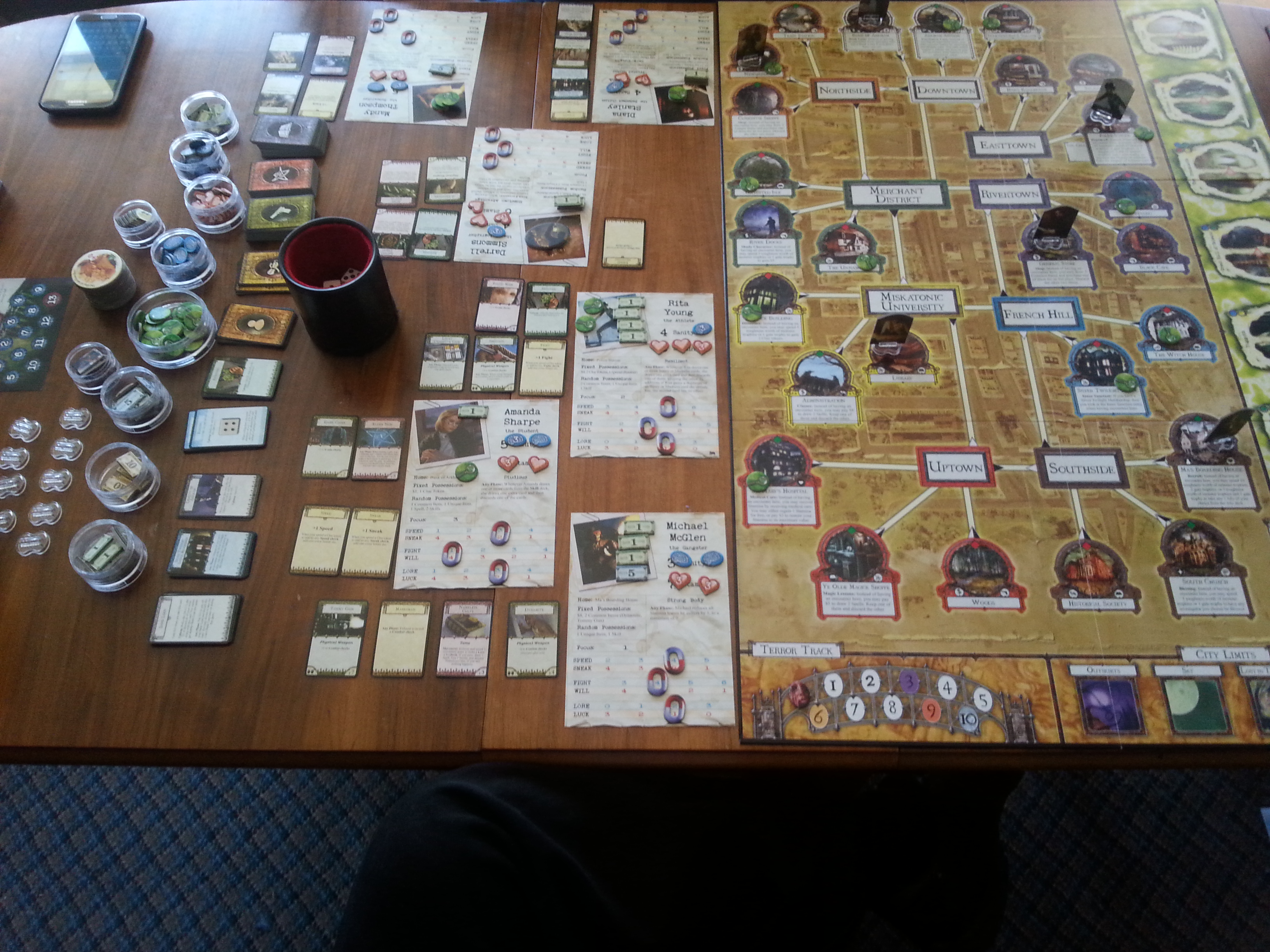 Play Through #6: We included Mike’s fiancée Bekah in the game. We all played two characters each and had the rules down, save for that important monster+gate one, and battled Shub Niggurath. We fought maybe one or two monsters out of sequence and had five elder signs on the board sealing gates. THEN…monster surge, with two gates open. Brought TWELVE monsters out. Filling the outskirts several times and raising the terror track. That happened at least four times, again, with only two gates open there was a monster mash party around the two gates (which were in adjacent areas). The terror track reached ten, Shubby-kuns awoke, immediately devoured both of Mike’s characters and one of mine (no monster trophies…) and my remaining and Beckah’s two characters did battle. We took her down to half damage before I couldn’t sneak anymore and was devoured. Without me there to cure her sanity Beckah was offed in short order and we lost. We did so much right this game EXCEPT… We still hadn’t remembered to spawn two monsters every gate opening and, Mike, during the final battle (he was managing the Ancient One since his characters were, ya know, dead) said, “Oh…I’ll..uh tell you later..” “Later” was the next day when he texted me and told me Shubby-wubby was Physically Immune. Meaning only my one holy water usage and Beckah’s spell (which I was healing sanity so she could use) and her magic knife would’ve caused damage. So we just lost WORSE than we actually did.