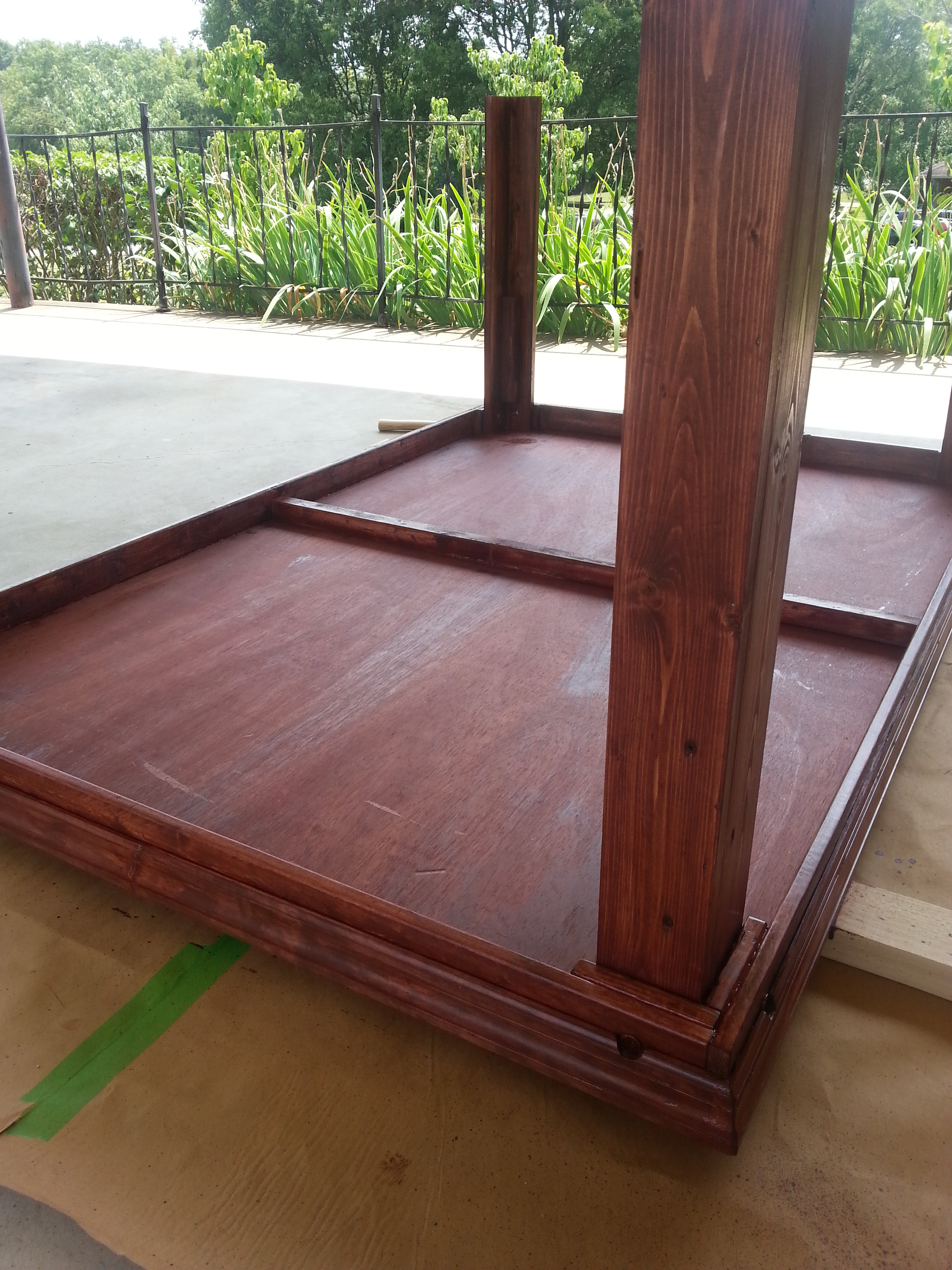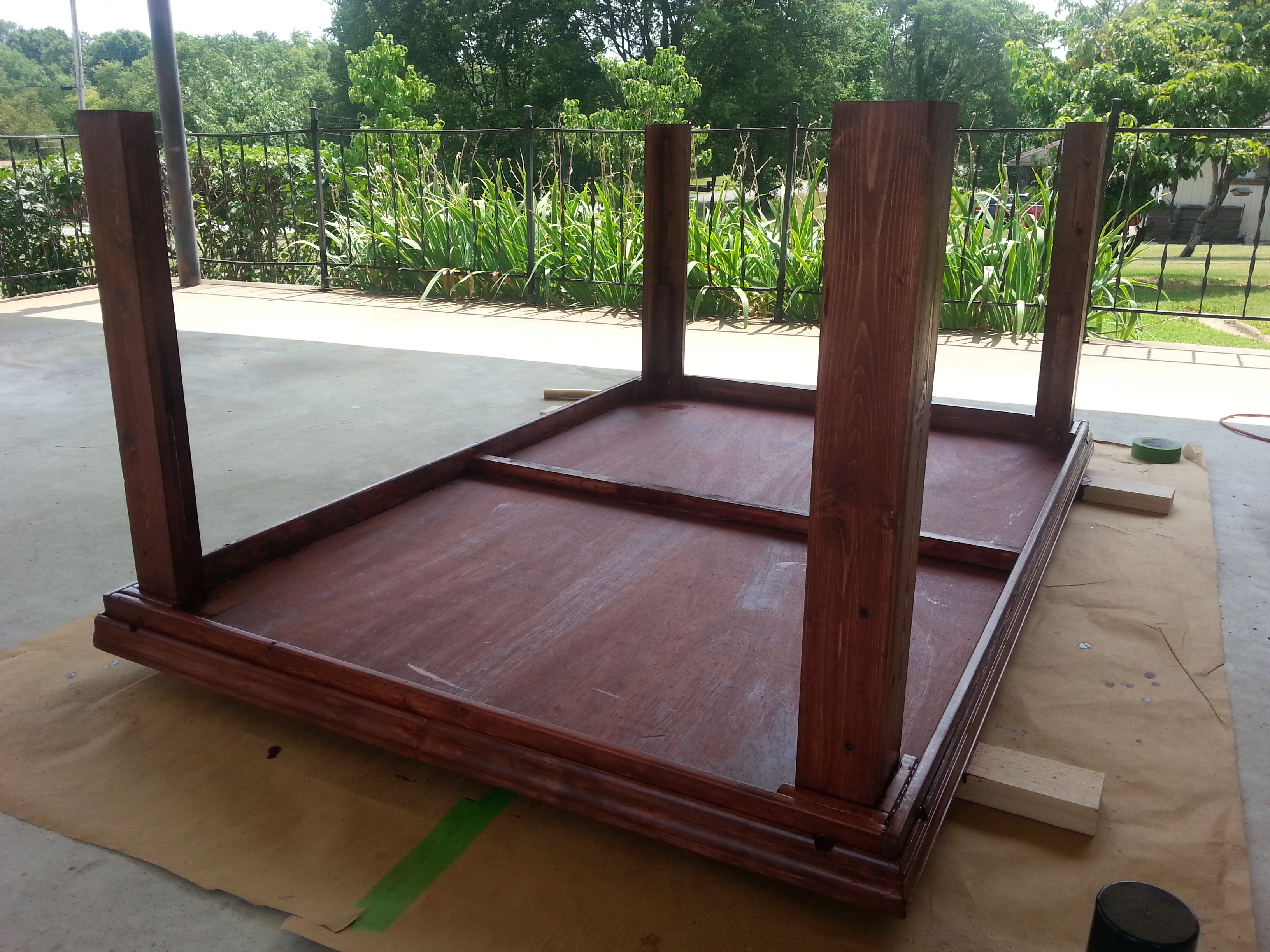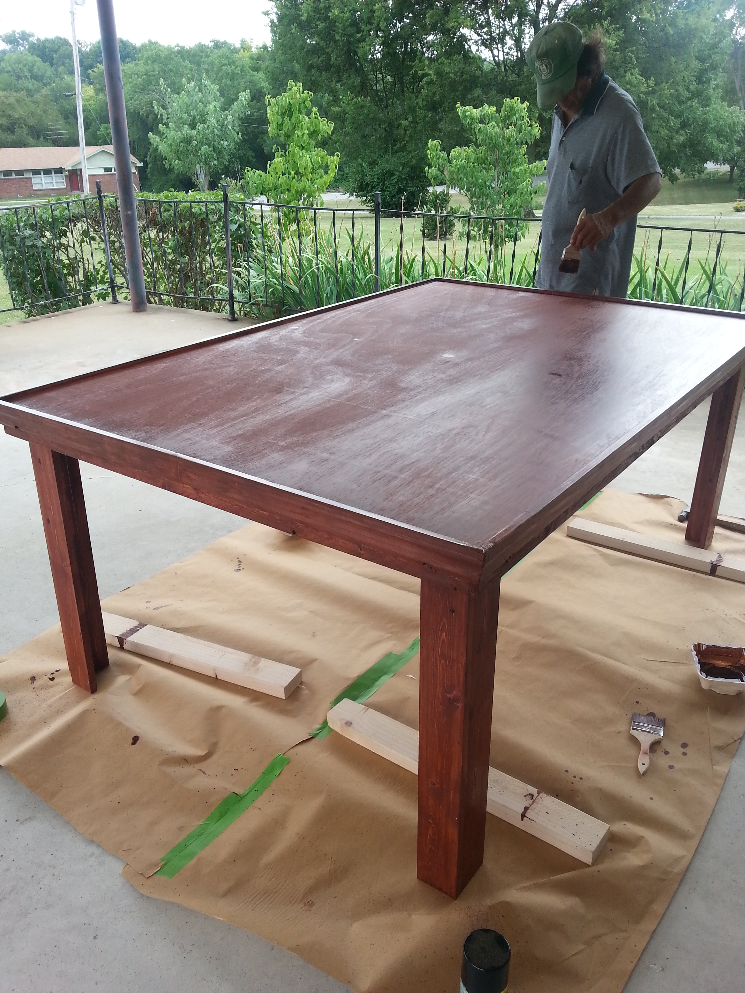I originally wanted a large 4×6 table (standard games of 40k, big enough for full Arkham Horror) with pull-out player places and shelves underneath. The realities of moving a table that size quickly set in and I went with basic 4 legs, solid top, moulding on the edges. All in all it worked very well and after a coat of red chestnut stain, it has a nice antique furniture look to it: