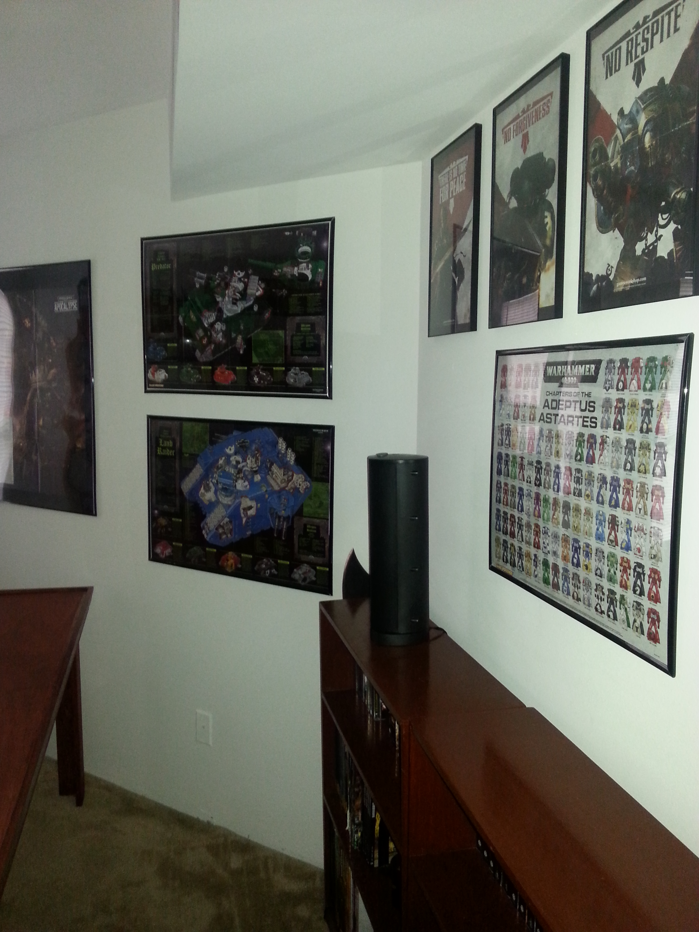 The two book cases at the bottom of the frame I’ve had since I was a kid. One was my sister’s and one was mine. My dad stripped and refinished them for me. The posters here I got from a guy on eBay who I believe used to work in a Games Workshop store or retailer. On the far left is a diagram of a Stompa (baneblade on the reverse) the diagrams of a Predator tank and Land Raider. The one nearest is the great Chapters of the Adeptus Astartes and the ones above that came in White Dwarf Weekly during the 7th Edition launch.