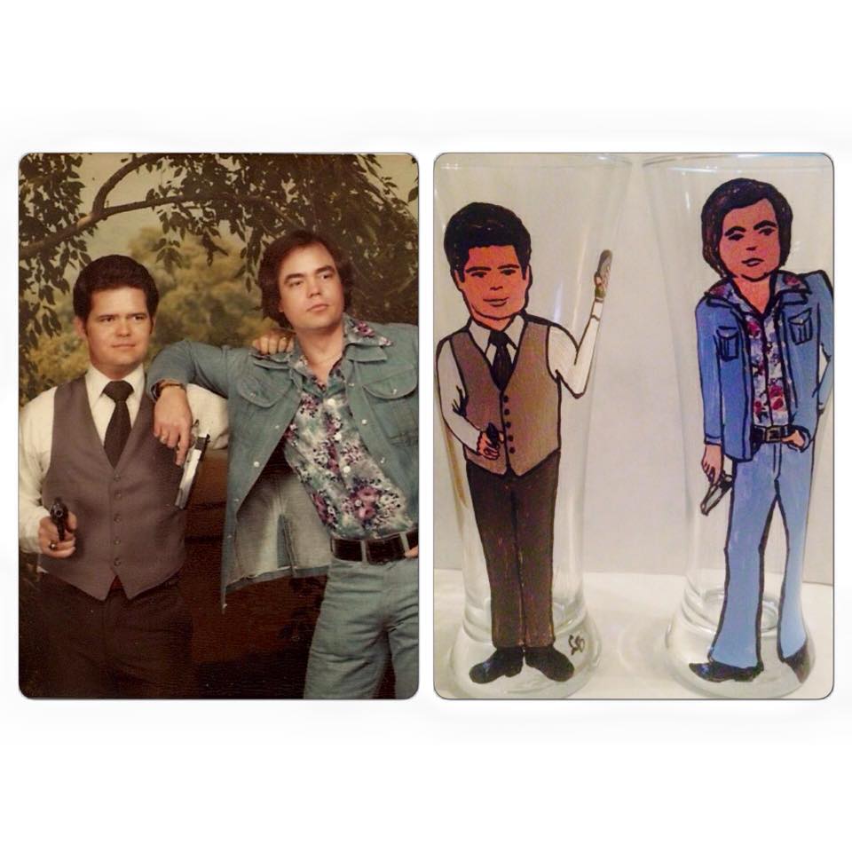 I don’t really have a favorite; I like them all for different reasons. That’s probably because I have mostly painted these for friends, and when I feel like I have captured the personality of someone I love already, that makes me love the little portrait as an extension of that. I have done a few for people I’ve never met, and I feel like I have kind of gotten to know the person (and sometimes their pets!) just from studying their photos so much. Even though they are more time-consuming, I think I like doing sets. Seeing the “interaction” of a mom and siblings, groups of best friends, etc. all lined up is really funny to me, especially after a couple of glasses of wine. I gathered together many of the Christmas gift glasses while I had them all together on my table, and it was almost surreal to see so many people I knew “looking back at me” in one spot. If I HAVE to pick, I think the set of draft glasses depicting my Dad and his former law enforcement partner Bill Rhegness in the early 1980s during a spoof Olan Mills shoot may be my favorite. I did a set for Bill at his request, and then of course, Dad wanted a set, so I replicated them. My Dad has been courageous and determined fighting the effects of treatment for Glioblastoma Multiforme (GBM), an aggressive and usually fatal type of brain cancer, the past two years, and Bill has been up to visit him several times during this time. Giving the two of them a laugh over those glasses was rewarding.