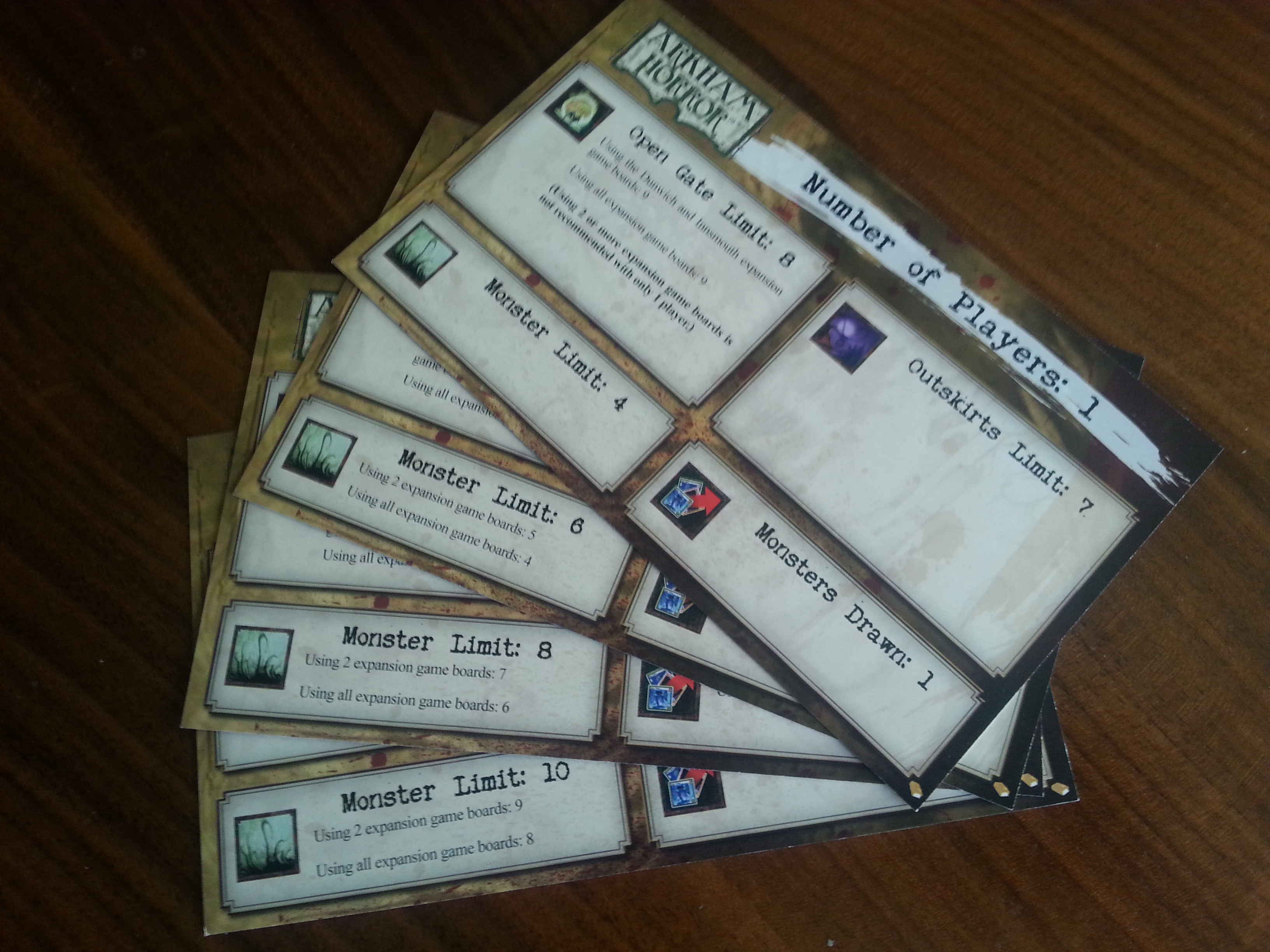 3.) Keep the Rules Handy When Playing: This might sound basic but you’ll be surprised how often it comes up… Fantasy Flight makes incredible games that can be very thick in rules with instruction books that can feel vague and difficult to navigate. You’ll only learn the rules while playing but you’ll have to consult them a lot, especially during your earliest games or when something uncommon occurs. Keep them close by. Mark the pages, because the citation for Blessings and Curses is on one page in the index but how they behave during upkeep isn’t in the same citation. Eventually you’ll get them memorized but it never hurts to have them close by if needed. As an aside the Miskatonic Horror expansion isn’t a true expansion as it’s more an add-on to the base game and all the other expansions. It DOES come with great little reference cards that explain how many monsters, gates, etc are allowed based on the number of players. They’re awesome.